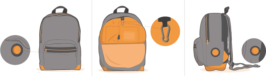 There is a small loop with carabiner to the main compartment to hang your feeding bag and there is a large grommet leading to the front pocket to store your pump. There's a large grommet on the left of the backpack to pull your tubing through, and a small loop with carabiner to secure your excess tubing.